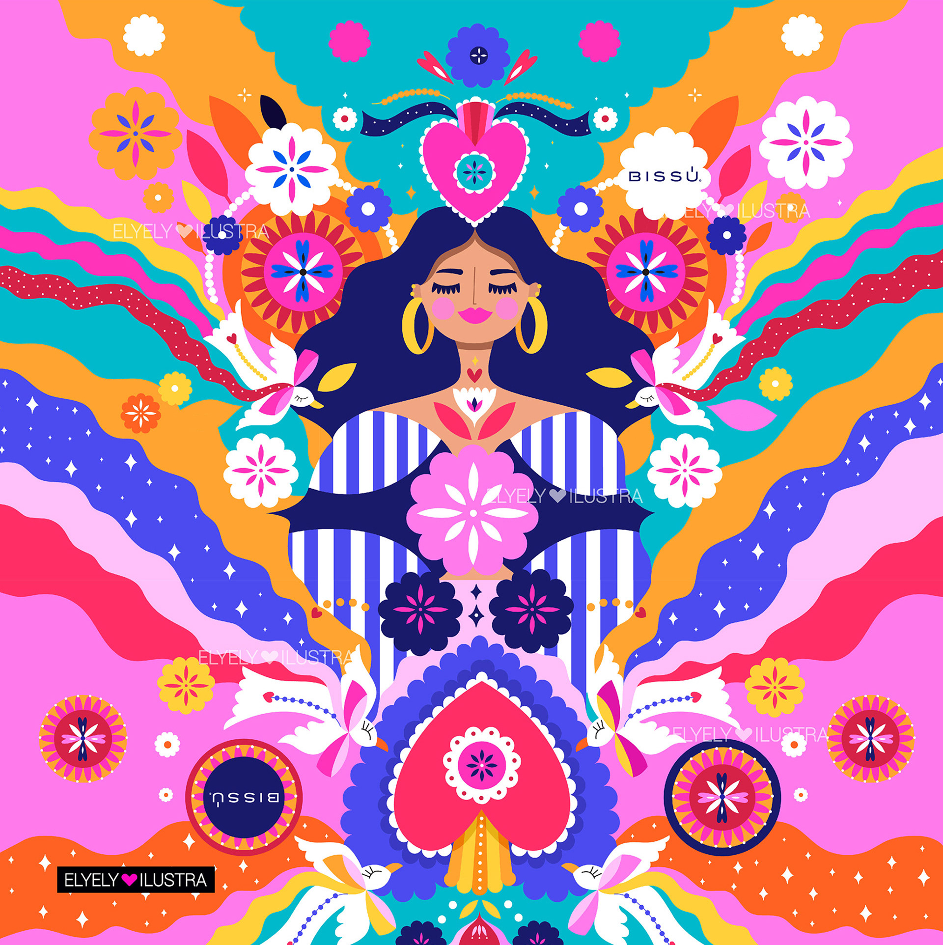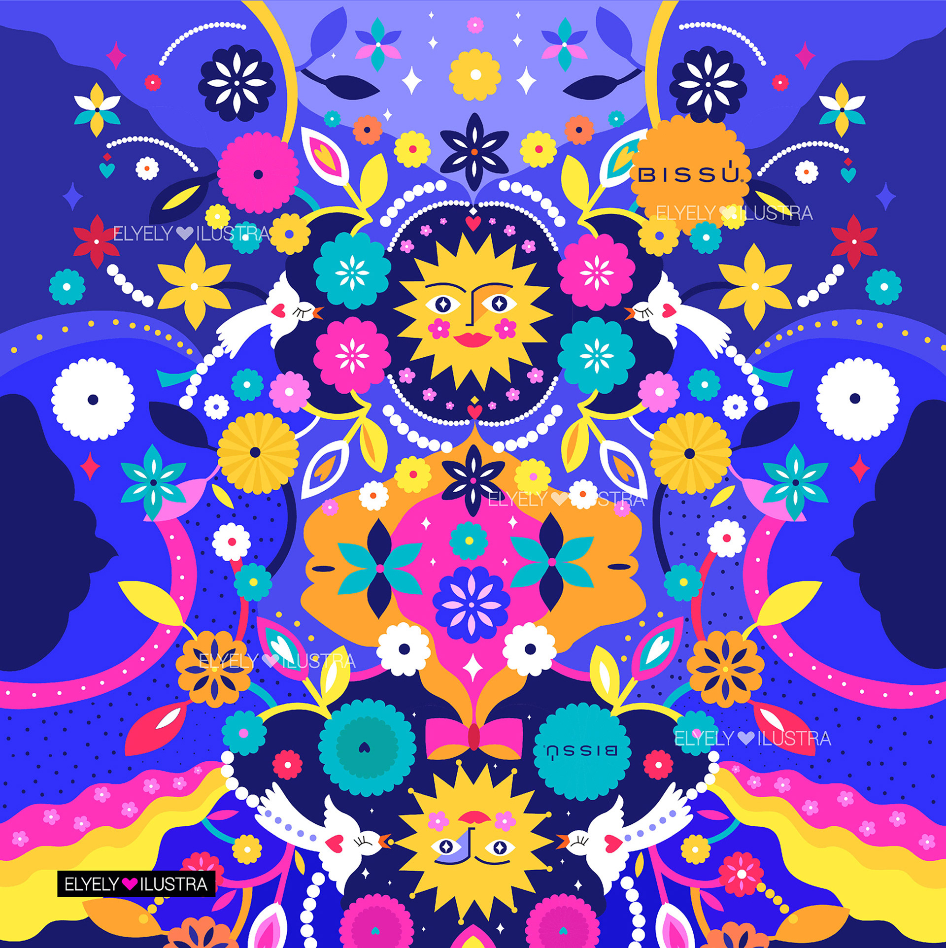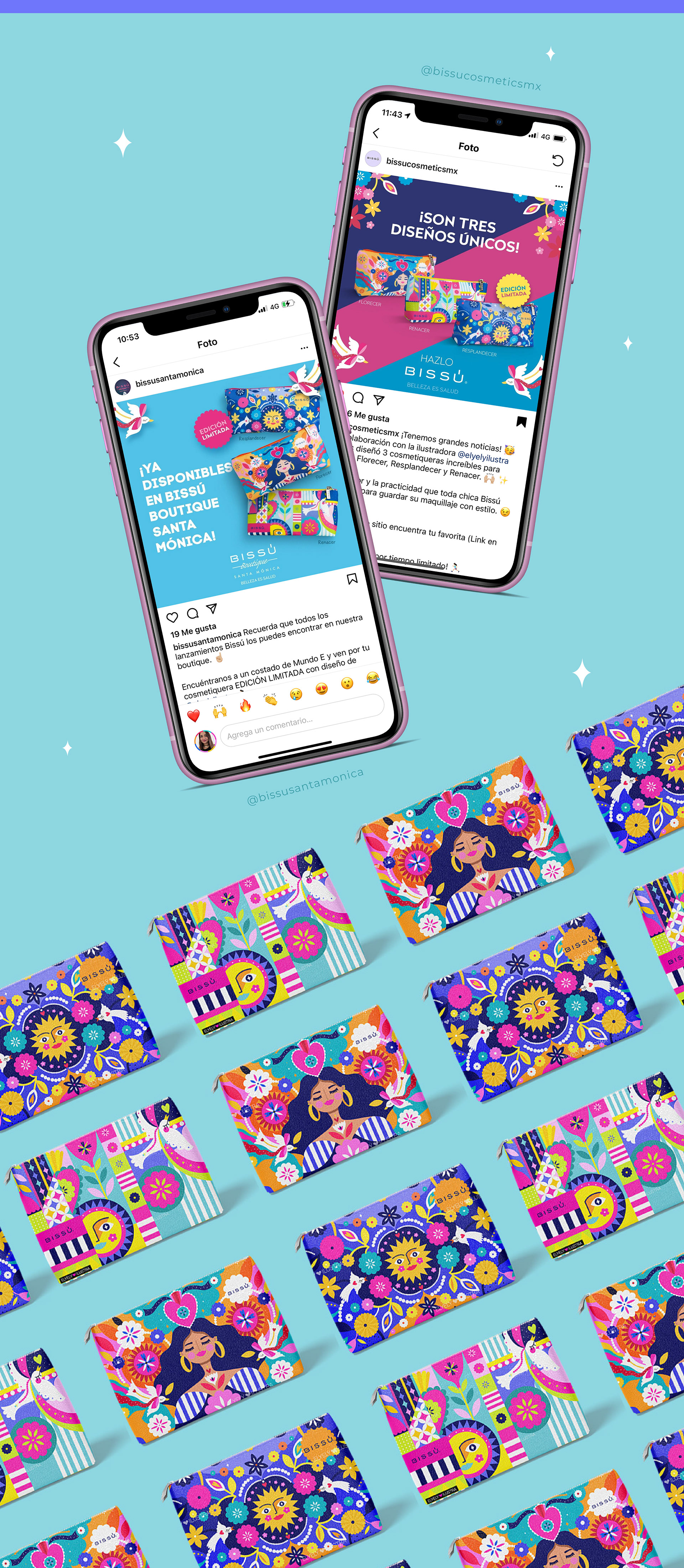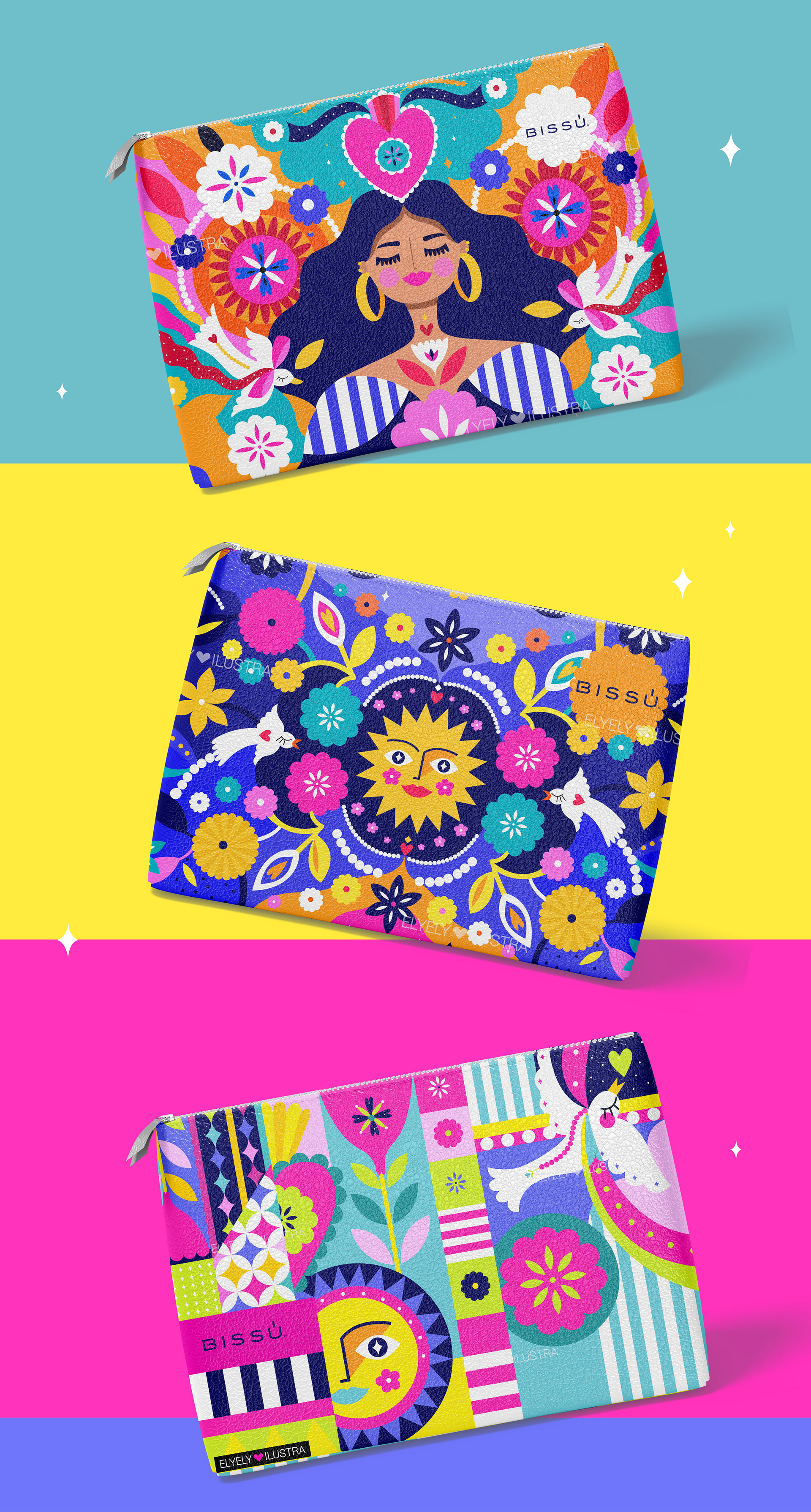 Illustrations for Bissú Cosmetics ® involved in makeup bags.